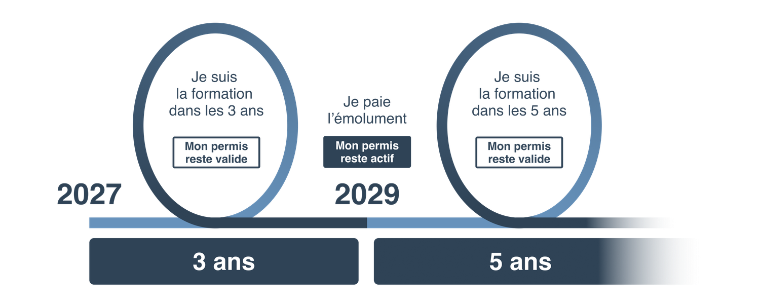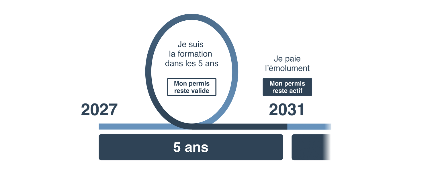 Par exemple, si une personne suit 2 heures de formation supplémentaire par rapport à ce qui est exigé durant les 5 années de validité de son permis, ces 2 heures ne pourront pas être reportées sur la prochaine période de validité.